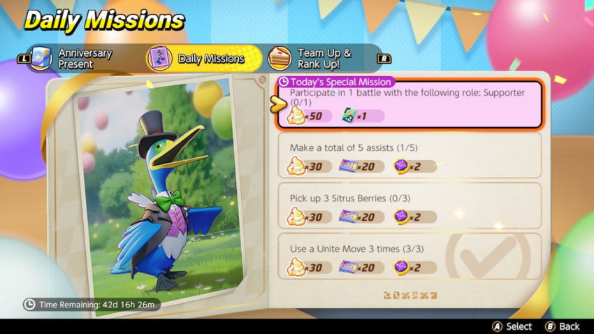 Disse faner byder på udfordringer og ting, som du kan arbejde med under Pokémon Unites jubilæumsbegivenhed. Jubilæumsgaven kan indløses én gang om dagen til præmier. De daglige missioner er de opgaver, du skal udføre for at tjene Frosting, sammen med andre mindre belønninger, såsom Aeos Tickets og Item Enhancers. Endelig er teamet op og rangerer op! siden er de rangerede kampe, du kan gennemføre for at tjene frosting. Du vil modtage 50 glasur for hver spillede kamp. I modsætning til de andre opdateres denne fane en gang om ugen.